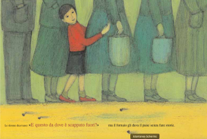 La portinaia Apollonia è una storia lineare e un testo asciutto, dedicata alla paura e al pregiudizio. “La storia di un bambino che si chiamava Daniel e di una portinaia di nome Apollonia. La portinaia portava occhiali con i vetri grossi. I suoi occhi sembravano pesci grigi in un acquario”. Autunno 1943: un bambino ebreo e una città dove comandano i soldati cattivi. Papà non c’è, mamma lavora a casa e Daniel deve correre a fare la fila per comprare da mangiare.